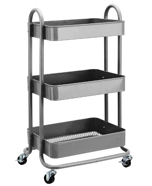 A simple rolling cart can be used as a nightstand or next to your mini fridge to hold all your snacks. https://geni.us/qmnnmx