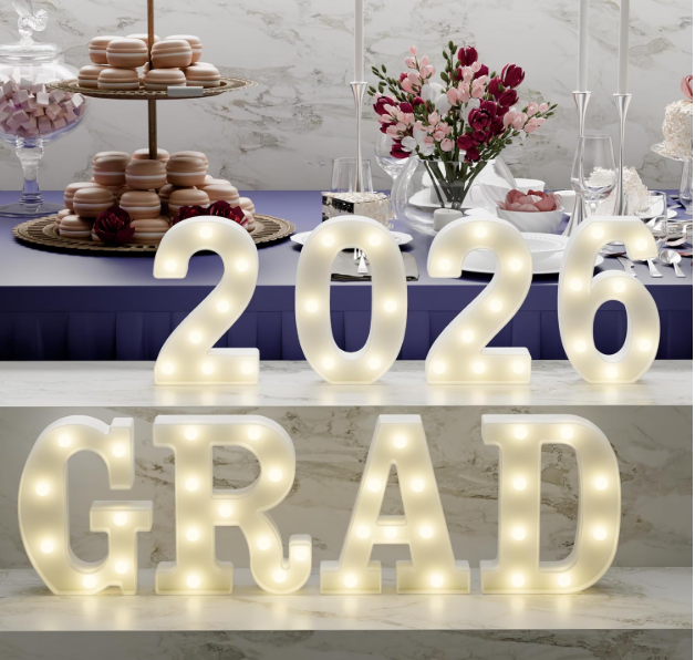 8″ LED Long Marquee Light Up Letters ‘Grad 2026’ can be used as a table prop on one of your tables.