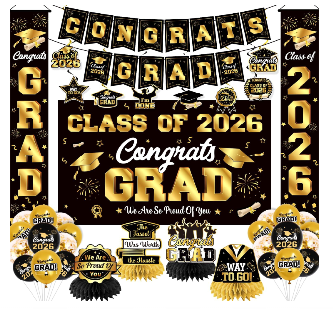 Class of 2026 Black and Gold Party Decor Set include Congrats Grad Banner Graduation Backdrop Class of 2026 Balloons Party Supplies.